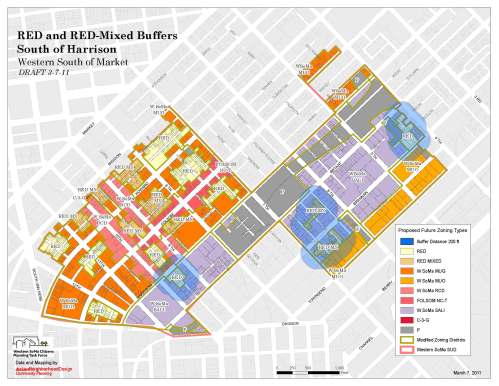 The 200 foot buffers were arrived at in discussion with the neighbors who would be affected by the introduction of new entertainment venues to their surroundings. Those people who live south of Harrison Street have had to come to terms with the fact that their homes will remain a nonconforming use, they will continue to have to get along without the amenities and infrastructure they’d like to have and will have to put up with additional noise and nuisances if the plan is adopted. Considering the fact that SoMa blocks are 600×800 feet, a 200 foot buffer did not seem to be asking too much of the industry.