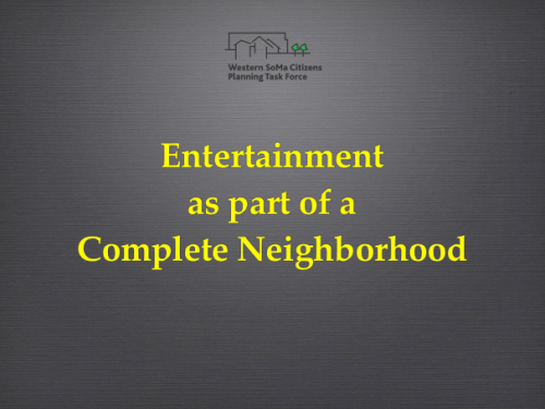 The discussion will focus on entertainment in the Western SoMa Community Plan. Commissioner Joseph will give us a brief history of entertainment in Western SoMa and someone from the Planning Department is supposed to inform us on the impact of current and future zoning in Western SoMa. Continue reading